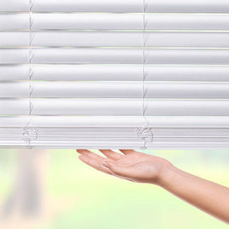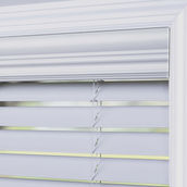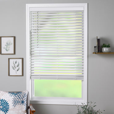 Faux wood blinds offer two slat sizes and three valance styles in bright white color.